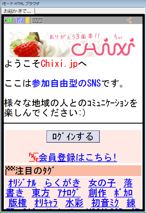 当サイト、お絵かきできるイラストSNSのちぃが今日で三周年を迎えました。 皆様の叱咤激励があったからこそ、ここまで続けられるサービスになったと思っております。 本当にありがとうございます。 この1年、従来のちぃではできなかったような新しい機能や サービスや大きなことを実現してきました。 ・携帯版ちぃの全面リニューアル(写真小1) ・サイト内で実装されていたSNS内で書いた日記の 外部公開機能を拡張し、日記やイラストをまとめて閲覧可能な Blogサイト ちーずBlog(http://blog.chixi.jp/)の開発 ・オリジナルTシャツ作成サービスtmixとの コラボで実現した「お絵かきTシャツ作成サービス」(※1) ・初めての公式オフ/おたくま(※2)&ゲーム派ドットコム(※3)との 合同オフ(※2) ※1 Chixi(ちぃ)×tmixコラボのオリジナルTシャツ ※2 おたくま主催 「3サイト合同大規模オフ会」開催のお知らせ! http://www.otakuma.net/news/20090909.html ※3 おたくま - おたく趣味でつながろう!ソーシャルマッチングサービス http://www.otakuma.net/ ※4 (GC)ゲーム派ドットコム http://www.gameha.com/ 今年は新たにアンドロイド用アプリの開発(写真小2、近日公開予定)や サービスの拡大に伴って複雑かつ分かりにくくなってしまった 様々な機能の整理・整備等を行っていく予定です。 今後とも、ちぃをよろしくお願いします。 ちなみに現在開発中のアンドロイドアプリは 美人時計をヒントに以下のようなアプリを開発中です (完成時は異なる場合があります) ・現在の時刻を表示し、1分ごとにランダムで別のイラストも表示 ・各イラストへの対しGoodが送れる ・マイアルバムに登録したイラスト(※5)でのローテーション(※6) ・ランダム表示されたイラストのマイアルバム登録(※6) ・マイアルバム表示時のマイアルバムからのイラストの削除(※6) ※5 マイアルバムとは各イラスト詳細ページ表示時に イラストを登録できる機能です。 ■自分のマイアルバムを開く http://chixi.jp/?m=pc&a=page_h_illust_list_mypict ※6 こちらの機能を使う場合、ログインが必要です。