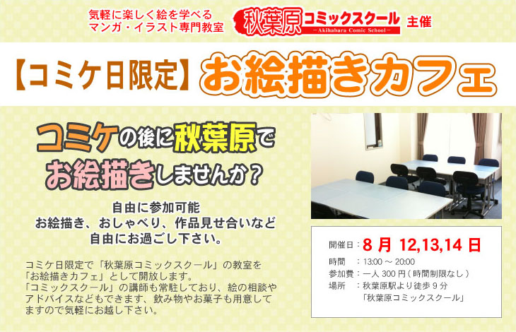 【コミケ日限定】お絵かきカフェ開催のお知らせ コミケの後に秋葉原でお絵描きしませんか? 自由に参加可能 お絵描き、おしゃべり、作品見せ合いなど 自由にお過ごし下さい。 コミケ日限定で「秋葉原コミックスクール」の教室を 「お絵かきカフェ」として開放します。 「コミックスクール」の講師も常駐しており、絵の相談や アドバイスなどもできます、飲み物やお菓子も用意して ますのでお気軽にお越し下さい。 - - - - - - - - - - 開催日:8月12,13,14日 時間:13:00~20:00 場所:秋葉原コミックスクール 受講料:1人300円(時間制限なし) 問合せ:http://comic-school.jp/info.html - - - - - - - - - - 詳しくは秋葉原コミックスクール特設ページへ。 http://comic-school.jp/kouza.html#kouza2