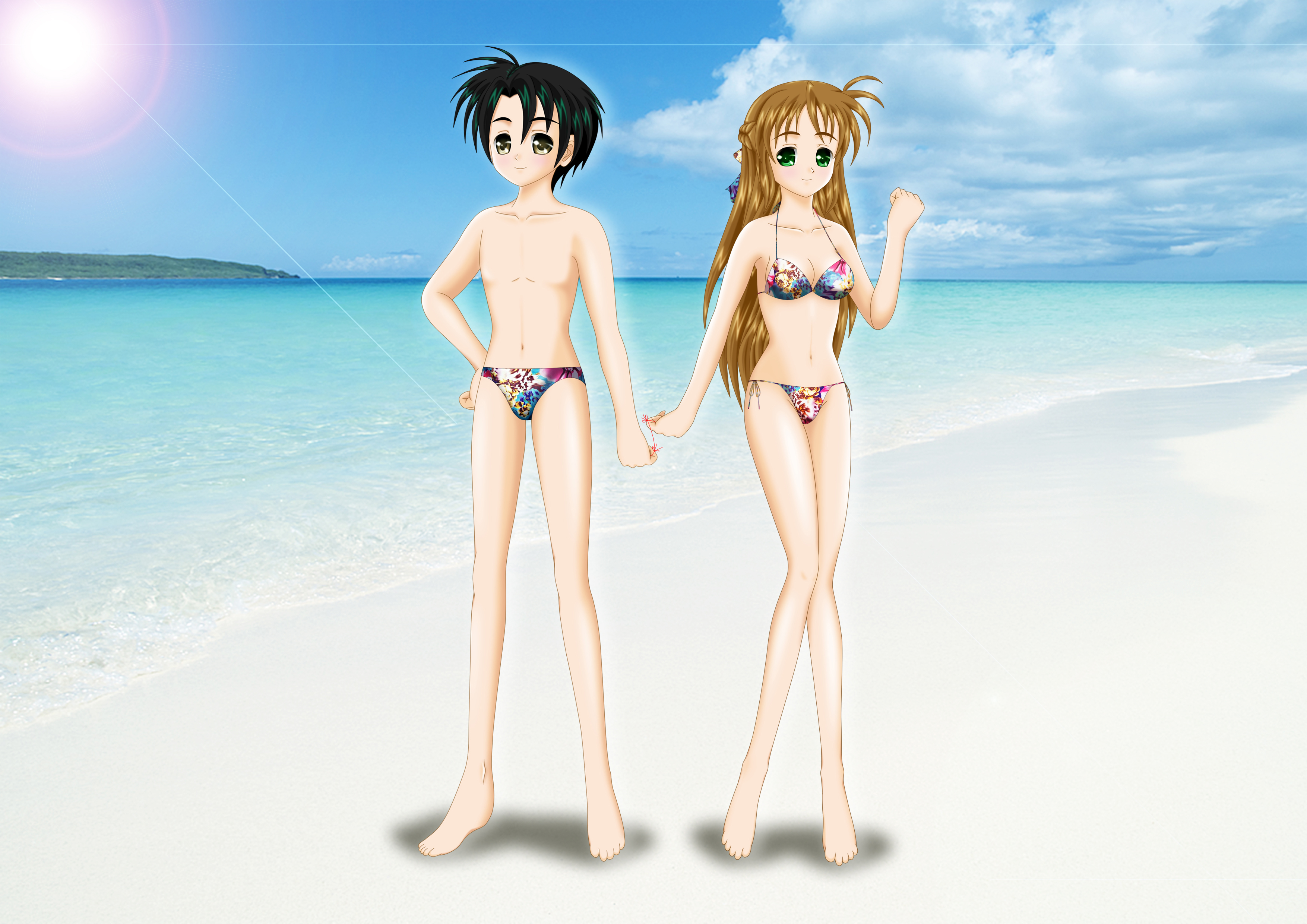 | 説明文 | 前のイラストに続き第二弾です。 表情に紅を差して少し初々しい感じにしてみました。上手く表現できていればいいのですが。 毎回悩むことですが、水着イラストは服などのごまかしが利かないので難しいです。 それにしても何故こんな恥ずかしそうにしてるかって? 実は二人はまだ中学生なのです。 その上ペアルックだし、小指には何か結んでるし。 満足いかない部分がありましたのでイラスト更新しました。 |