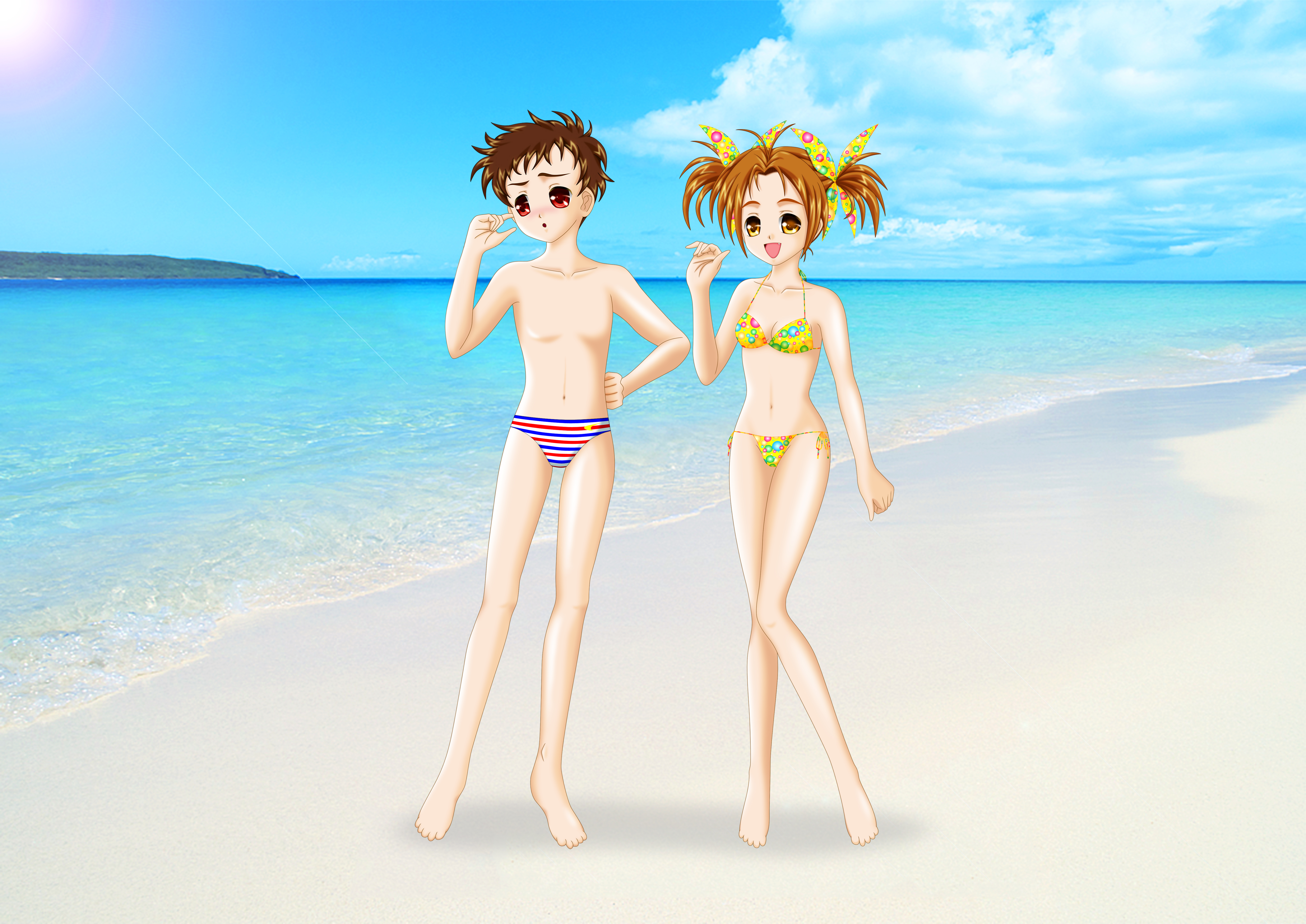 | 説明文 | 以前に公約した通りカップルイラスト第三弾となります。前回紹介したロリな妹も彼氏はしっかりとゲットしていたようで。 恥ずかしそうな彼氏ですが、まあ中学生なら仕方ないよね、ということで。 ペアルックなのでカップルであることがモロバレです。ていうか、中学生とはいえ1年生がこんな水着でいいのでしょうか!?まあ、とある知人からリク受けて作ったんだけど。 |