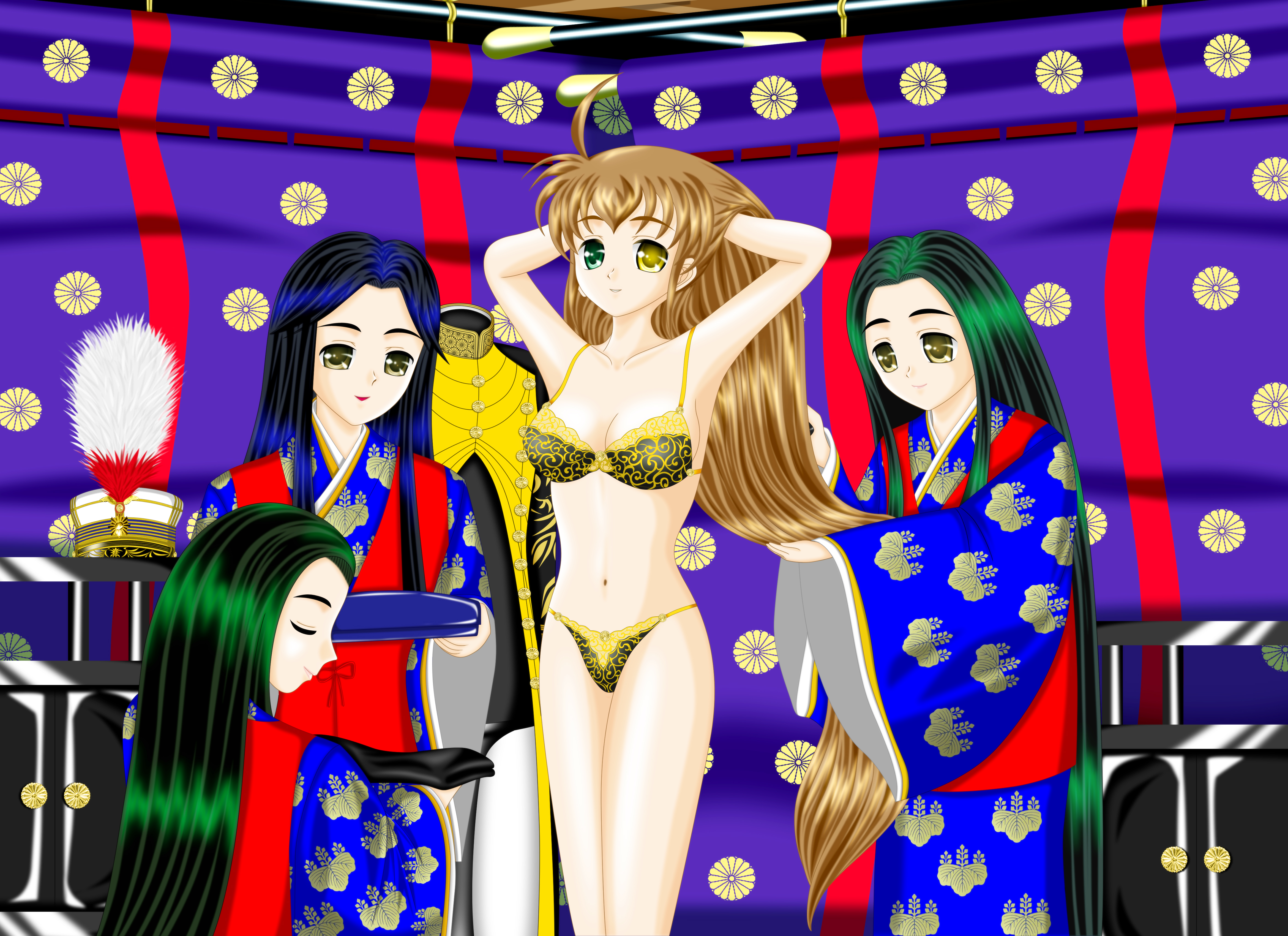 何と、大元帥の場合は下着も専用となる。普段は一人で着替えるが、今回の儀式は特別に女官に傅かれながらの着替えである。