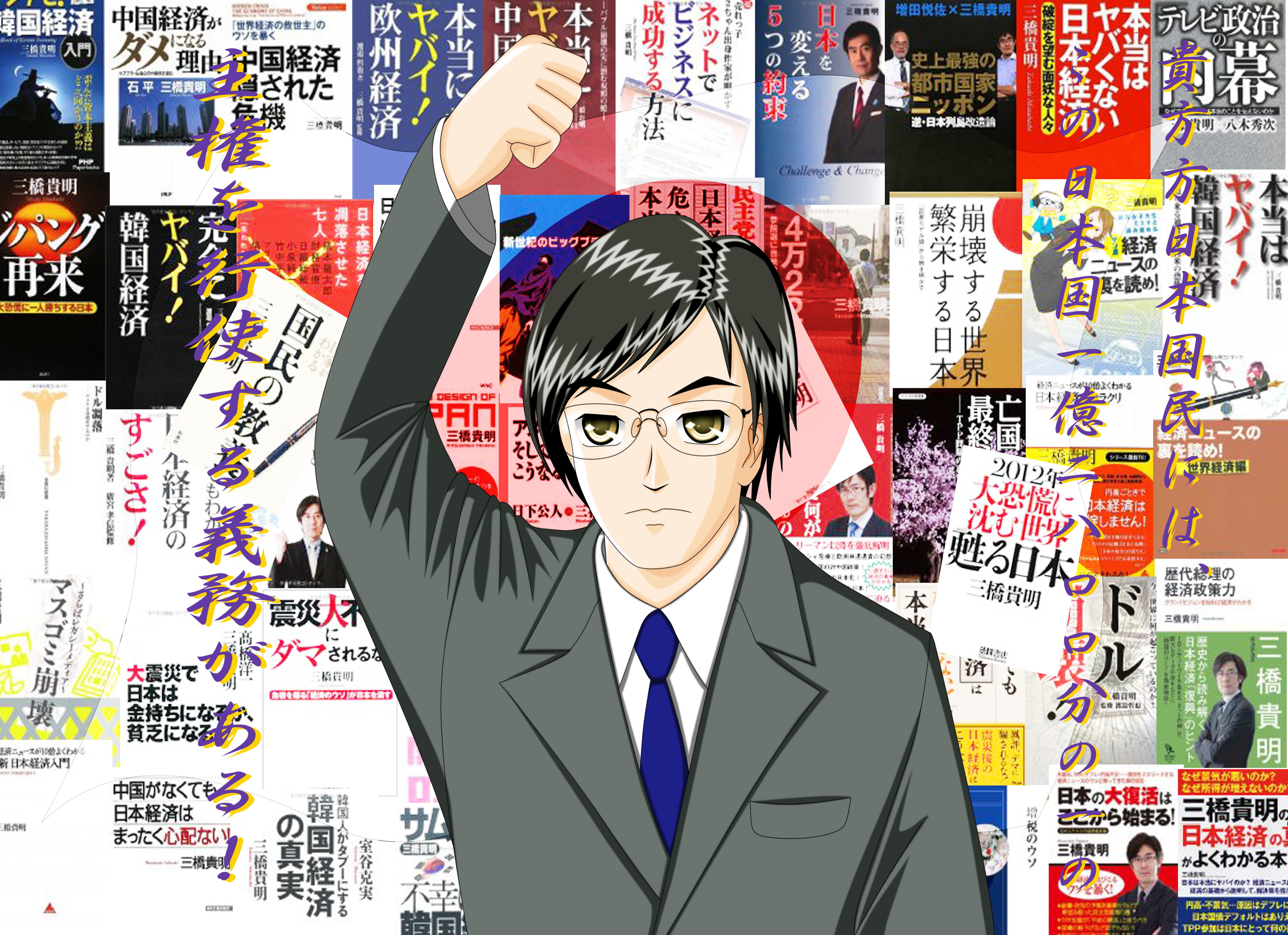 | 説明文 | 今最も注目されている経済評論家、三橋貴明氏のイラストです。普段は萌え絵やメカが主な私が今回似顔絵に挑戦しております。 でもって、背景はこれまで彼が世に出した著書であり、2007年のデビュー以降彼の著書は実に50冊を超えています。普通、50冊といえば10年やって出せるかどうかという冊数ですから彼の精力的な活動には頭が下がる思いです。 |