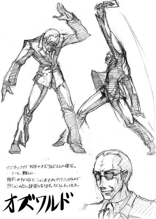 主に、格ゲーの動画・画面見ながらモーションを模写して練習してたんですが、鉛筆画をちょっと加工して見栄え良くする方法を模索したり、それを講座にして投下したり、KOF11のカッコイイ爺様・オズワルド氏のモーション模写をしたのでその方法で加工して投下したりしてました。
