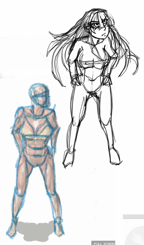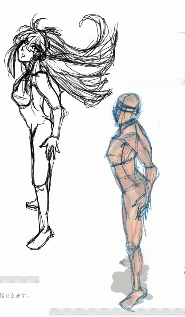 女性のプロポーションの確認その1。POSEMANIACSさんの人体像は8頭身かつリアル系なので、相当頭が小さいです。漫画絵にするにはどの程度頭を大きくするか、大きくしてバランスが取れているか、に注意して練習しました。後は表情でしょうか…髪の毛も漫画的に、表情に合わせてなびかせてみました。筋肉を意識しつつも、漫画の線だとどこまで簡略化するか、特に女性は難しいです。練習、練習。