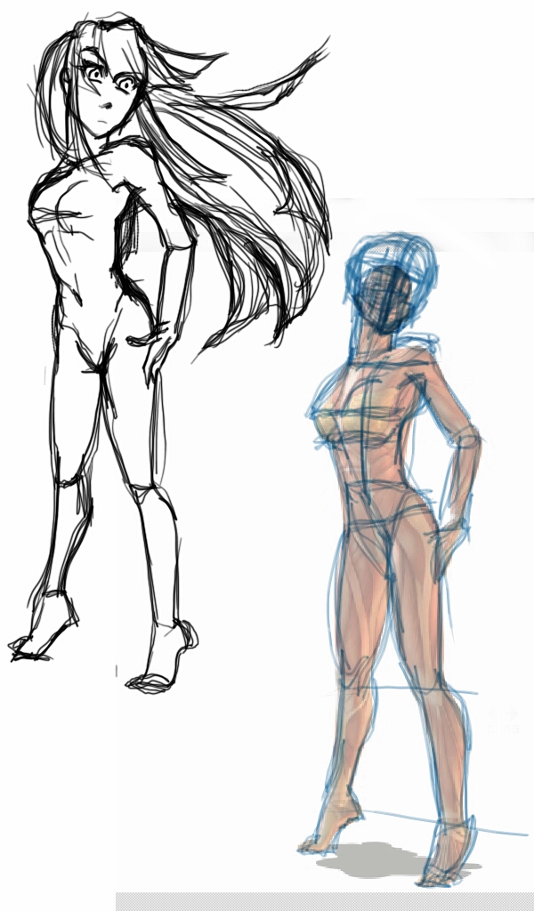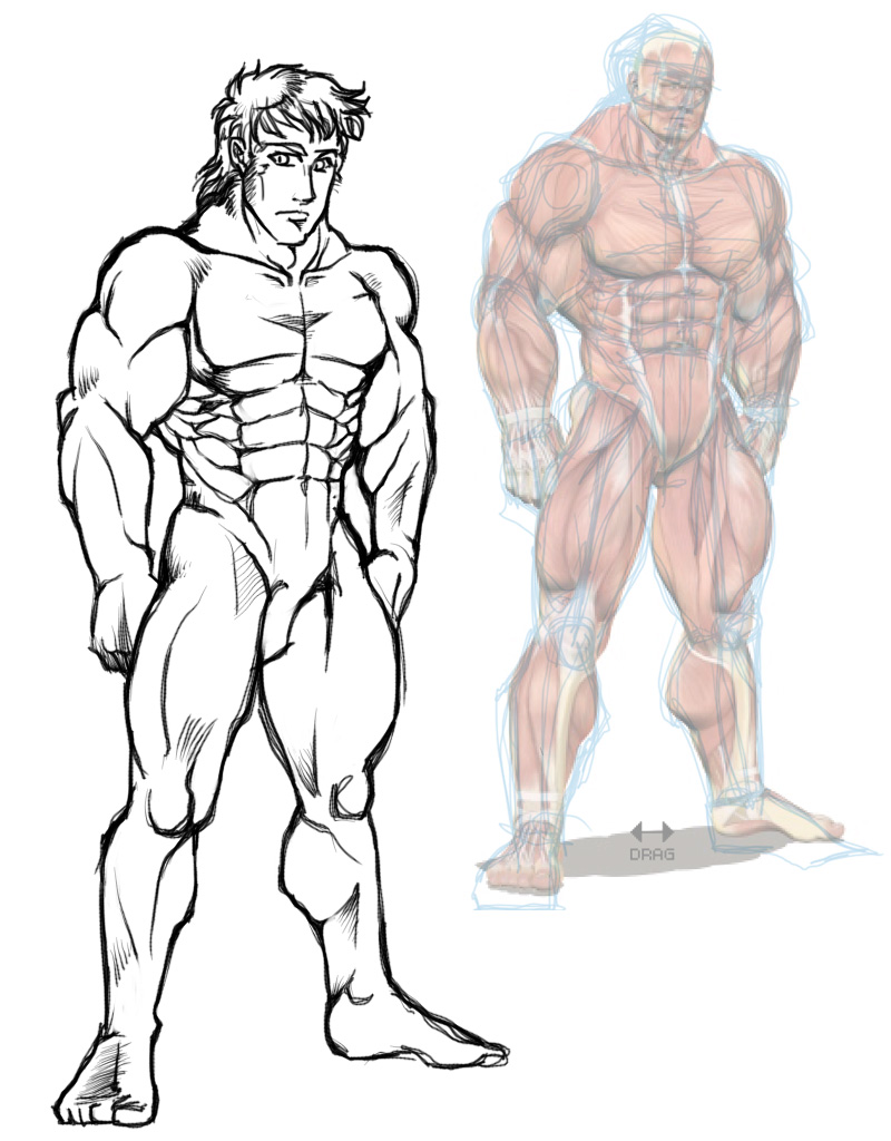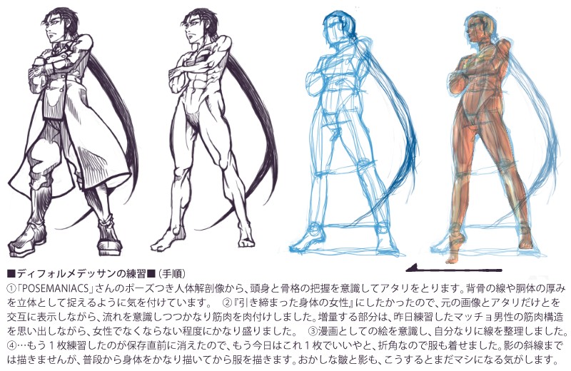 (※要するに、デッサンの練習のため、正しいプロポーションのお手本として、人体解剖像の画像を下敷きにしながら自分絵に直す練習です)