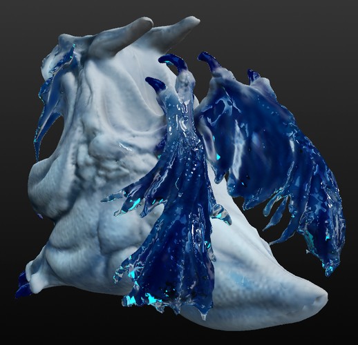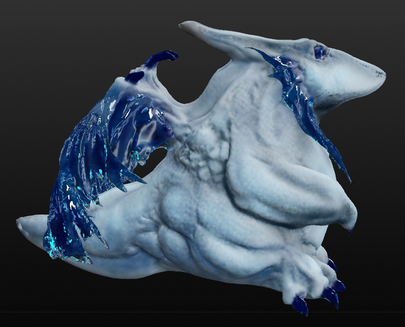 このソフト、わりと凹凸がつきやすいので、リアルめのものの方が合っていると思います。なので、今までの筋肉練習を元に、ちょっとリアルめに筋肉なんかも盛ってみました。足回りと翼を支えるアバラ回りの筋肉とか。 D-Dragonの翼は『水晶質の透明な皮膜』という設定なので、初めてリアルカラーで再現できました。