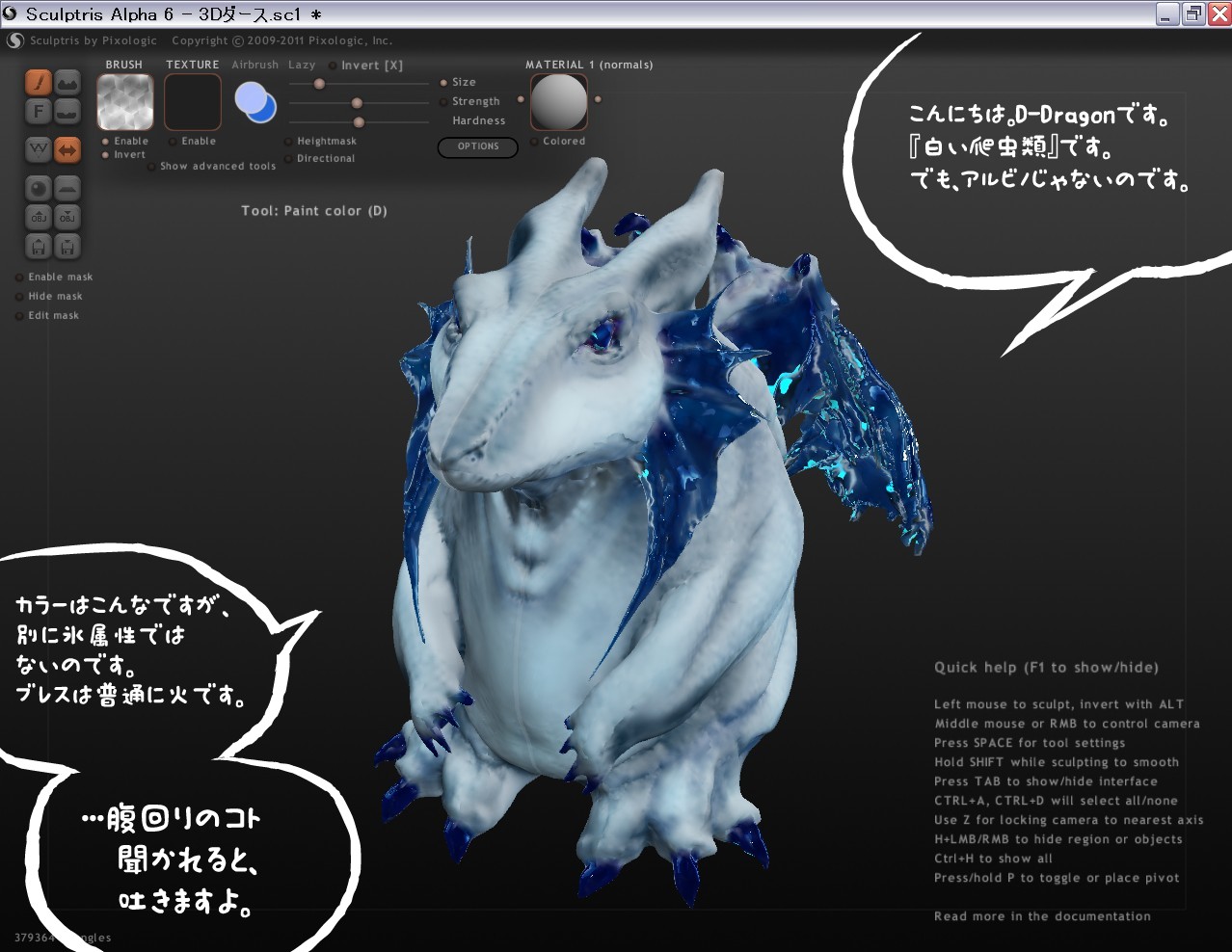 えー、まず言い訳から。 昨日は、3D軍帽を完成させていたんです。テクスチャマッピング思ったより簡単だハハ~ン♪ とか、いい気になって、これ終わらせてから1枚練習しようと思っていたのです。で、最初は上手く行きました。ちょっとリアルめのテクスチャなんかも作っちゃって「テクスチャなんか2Dだから簡単だな!」とか言ってたら、……帽子の上部に入るライン。赤いライン1本ですよ。そのラインが鬼門で、何度描いても変になる、アレ? これ、テクスチャ展開して描いてたんじゃ無理じゃないか? ……とやっと気付いたのが夜の1時でして。『直接3D画面上でテクスチャを(簡単なのでいいから)描けるソフト』が必要だと判明しました。 で、フリーソフトで探した結果、3本が見つかりました。 「Blender」→操作が難しすぎる 「Pixexix」→使い安くて良さそう、だが商用不可なので配布素材にはできない。 「Sculptris」→本来は、粘土をコネコネする感覚で3DCGを作るソフト。それにペインティングする機能もある。 そういう訳で、「Sculptris」を試してみた後で、ダメなら「Pixexix」のシェア版を購入しようと考えました。1900円ですし。 この「Sculptris」というソフト、操作が非常に簡単です。英語ですが、そもそも説明書の必要がない位基本操作が簡単で、チュートリアル画像も沢山あって、バカでも(例:私)1度見れば大体判(った気にな)りました。日本語版のページ・マニュアルもあるし。 ■Sculptris日本語版DL・マニュアルページ http://oakcorp.net/zbrush/sculptris/index.php 非常に操作は簡単なソフトで、画面上に粘土の塊が置いてあり、それをこねてつまんで伸ばしたり、押して凹ませたり、粘土を盛ったり。小学校の図工の時間に粘土で土鈴作ったのを思い出しました。左右対称ボタンがONになっていれば、片方いじるともう片側も作れるので、本物の粘土よりもむしろ簡単です。 …という訳で、なんか先ずは弄ってみはじめたところ、本当ーに粘土感覚で思ったとおりに形が動くので、つい夢中になって、気がついたら、なんか、こんなのができていました…。⇒小さい画像1枚目 なにやらえらく寸詰まったメタボなドラゴン……じゃなくて、私です。白い爬虫類のD-Dragonです。…なんか、小学校の図工でも、結局コレを作った気がします。丸っこいからそんなに変形の必要もない。小学校の時よりは、リアルに出来たと思います。 というか。絶対おかしいよ、このソフト。チュートリアルビデオとか、「プロが作ったらそりゃ、そんなクリーチャーもカンタンにできるだろうさ」とか思って見てたけど、なんか気付いたらこんなの出来てたよ。最初の粘土の中に埋まってたに違いない。初見で、マニュアル読まず、3D造形素人の人がいじっても、コレくらいは作れます。…いや、本当なのでやってみて下さい。 で、ペイントモードもやってみました。紙粘土にスプレーで色を塗っていく感覚そのまんまです。彫刻とかはやったことないのですが、プラモデル位ならちょっと。で、プラモデルに色付けるのと本当に同じです。凹凸のある部分だけ影の色を付けたい場合とかは、ボタン1個で「凹凸部分以外マスク」機能があるから、プラモよりよっぽど楽かも…。テクスチャも塗れるし。 そしてふと、材質も塗れるというコトに気付き、ガラス材質を翼と爪に塗ってみました。⇒大きい画像、他2枚 ……おかしい。コレもきっと、粘土の中に埋まってたに違いない。それで、窯で焼くと釉がガラス質になるのだ。 このソフト、わりと凹凸がつきやすいので、リアルめのものの方が合っていると思います。なので、今までの筋肉練習を元に、ちょっとリアルめに筋肉なんかも盛ってみました。足回りと翼を支えるアバラ回りの筋肉とか。 D-Dragonの翼は『水晶質の透明な皮膜』という設定なので、初めてリアルカラーで再現できました。 で、ところでコレ、どうすんの? ……使い道がなかったOTZ 折角なのでプロフ画像にでもします。 皆さんも是非やってみて下さい。本当にコレ、凄いから! で、当初の目的だった軍帽の3Dペイントはまだ、できてません……。