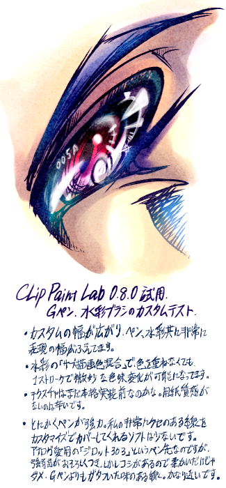 練習2日目です。今日はパソコンの前にいるので、「CLIP Paint Lab 0.8.0」(以下、CPL)を試用してみます。普段は『CLIP』(コミスタ・イラスタの公式サポートサイト http://www.clip-studio.com/clip_site/ )で素材配布をしたりしているので、コミスタ・イラスタは結構使い込んでいたりします。メインはIllust Studioですが…。今日はCPLの練習で、デッサン練習の代わりにします。明日はCPLでデッサン練習してみよう。 【UI】 CPLは一番最初のリリース時以来いじっていません。コミスタ・イラスタの後継ソフトCLIP STUDIOのテストバージョンと位置づけられたので、真面目にいじってみることにしました。UIはイラスタ系ですね。少しパレットの位置を変えたら普段の作業スペースと似た感じになりました。私的には使いやすいです。 【ブラシカスタマイズ】 さり気に「ベクターレイヤでパターンブラシが使える」とか、恐ろしいコトが書いてありますが……まずは、自分の愛用アナログペン「ジロット303」をGペンをカスタマイズして作ってみます。 ……何だこのカスタマイズ項目の数は!!? ちょっと、いきなりブラシ職人として「あったらいいなぁー」と思ってた以上に増えてます。水彩ブラシ系で威力を発揮するでしょうが、NekoPaintに有って、「コレがイラスタにもあればなぁ」と思っていたサブ描画色混合まで入ってます。……なんだこりゃ、ありえん。 [Gペン カスタマイズ] コミスタも統合する以上、Gペン類の描き味が命なのでまず触ってみました。普段WEB漫画も描くし、ペン画が土台なので、つけペンは多用します。デフォルトのGペンはひっかかりがなく、ヌルヌル動きすぎる感じです。確かに、SAIのペンに近いかも。愛用の「ジロット303」(ペン画用ペン)は、Gペン以上に強弱の入りが強く、かといって柔かいのではなくコシがあり、筆圧を非常に反映します。そして、アナログらしいブレがあるのが好きなのです。 CPL0.8.0では1つのステータス(ブラシサイズとか)に複数のコントロールを反映できるようになってますね。ブラシサイズを筆圧対応させるのはもちろんですが、更に別途でランダム率を設定できる様になったので、これを少し入れると簡単にアナログ風のブレが出ました。ペンをテストする時には、大体、目を描きます。気持ちよく描ける時は、セオリーのない描き方で、それでも命のこもった目が描けます。今回はかなり良い気がします。 [水彩ブラシ カスタマイズ] 「透明水彩」「塗り&なじませ」「不透明水彩」、この辺りが自分の着色の命です。「透明水彩」をカスタマイズし、「サブ描画色混合」の威力を試してみました。色は塗り重ねて混ぜていくのが基本ではありますが、アナログからやっていた人だと判ると思いますが、“そもそも最初に筆についている絵の具の関係で1刷毛でもムラができる”というのが自然です。筆の汚れ、同じ黄色で塗るにしても、すぐ前に青を塗った筆で塗れば緑っぽい色になってしまうし、赤を使った後の筆ならオレンジっぽくなります。この、“1刷毛の中の色ムラ”が水彩塗りの味を決めると思っています。なので、この機能が付いたことで、画材としてのレベルが変わった様に思いました。また、下の色との重ね具合も混合中心と上塗り中心を選べる様になったので、塗り重ねに幅が出ましたね。(この辺りはイラスタがNekoPaintに敵わない部分だと思っていたので、ネコペを研究して入れた可能性ありますね…) 【現状】 非常に期待が持てます。レベルは高いですね。画材部分だけを見たのですが、ベクターの強化が半端無いと聞いていますので、そちらも試して行きたいと思います。なお、イラスタの命は多彩かつ使いやすいテクスチャにもあったので、そこはまだ未実装の様なので、今後待ちでしょうか。今回は、「用紙質感」がつかえないので、仕方なく画用紙のテクスチャを上貼りしました。かなりアナログ風塗りが強くなった印象です。 評価:A(想像以上。今後の期待大)
