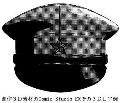 なお、日記添付の画像は、3D軍帽の完成品です。Pose Studioのモデル人形に被らせてます。うん、ピッタリ。それから、Comic Studio(EX)の3Dを線画(ベクター)とトーンに自動分解してくれる「3DLT」機能でレンダリングしてみた図が、小さい写真2枚です。ベクター線だから、線の強弱他の修正可能、トーン部分も網点の濃さ・種類等変えられるんですよ…? デジタル漫画の時代だなー、と思いました。