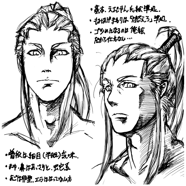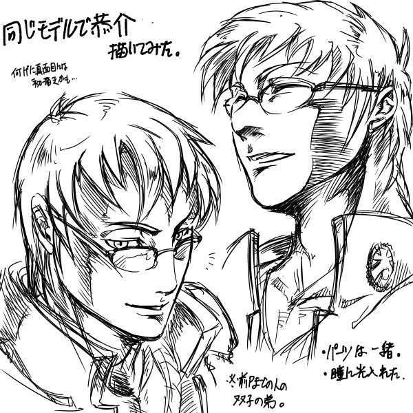 | 説明文 | 本日の人物デッサン練習その2。※「POSEMANIACS」(http://www.posemaniacs.com/blog/)さんの人体解剖像をラフな線でトレス・デフォルメしていくことで、デッサンの習熟と自分の漫画表現を模索する練習をしています。今日は「男性の顔」の練習。ジャス学の恭介です。1つ前の雹さんの双子の弟。パーツは一緒なんですよ、パーツは。 |