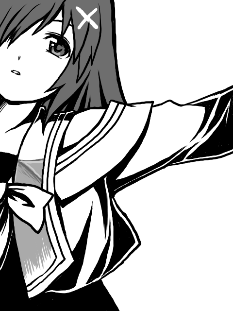 上着の襟の下(灰色の部分)はこんな感じかしらに。 この場合だと割と適当な感じにリボンがくっついている事に。 ワンピ側にセーラー風の襟がついてると仮定して (ワンピ側にある)セーラー風の襟を 上着の上に覆いかぶさる感じになるんだろうか。 うーん、まだ服の構造がうまく合致して無い気もする。
