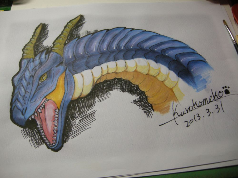 この間出先で描いたドラゴンをコピーして、コピックで塗りました。あ、コピック塗りは4月に入ってから塗りました。