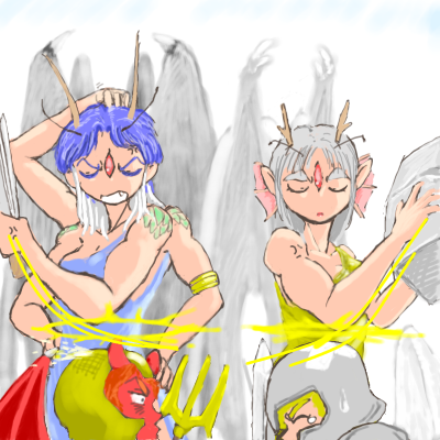 | 説明文 | 悪魔「悪魔である。」 天使「天使でございます。」 悪&天「二人揃えば・・・アポカリプスの到来じゃ〜〜〜〜!!!」 ?「やめぃ。」(炸裂する鳴り物ツッコミ) ?「似たもんどうしが、弱いもん巻き込んで、いちいち皆殺しだの何だの、えーかげんにせんかいワレぇ!」 ?「ワンパターンなんじゃボケェ!!!」 |