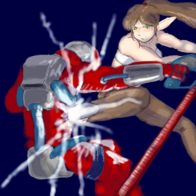 | 説明文 | あらかじめ用意した、「カードに封じた未完成の呪文(即応呪文)」に、「最後の一文字を詠唱で加え」(実行)開放する手段で、「接触雷撃+ソバット」を銃を棒で封じながら当てていく図。 従来の戦闘魔法術とは異なる、「野戦機動魔法術」を自らの実践で示す。 蹴りも「機動強化術」の電磁場を使って地味に加速しているため、凶悪な一撃。 足の当てる部分も、狙ってる部分も、よいこはm(ry |