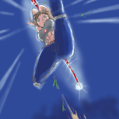 棍に強烈な電荷をかけつつ、大きく反りながら跳躍し、空中で足を振り下ろす勢いを加え、全体重を浴びせるように渾身の力で撃ち込む寸前の図。