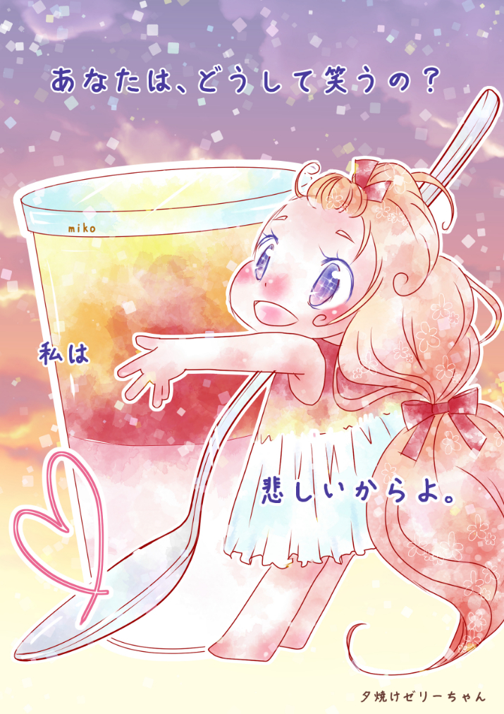 夏にセブンで販売していた 『夕焼けゼリー&もっちり杏仁』の擬人化です(*´ω`*) 夏が過ぎていくと販売されないので 販売中に、あなたに見つけてもらえて嬉しくて笑うの。 秋になって会えなくなっても笑顔の私を思い出して欲しくて笑うの。 でも夏が過ぎていくのは少し悲しい。会えなくなるから。 そんな夕焼けゼリーちゃんです♡