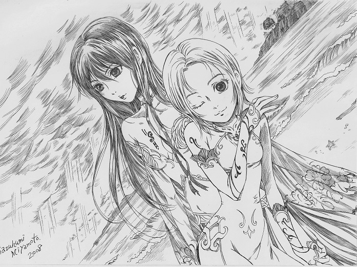 ちょっと訳あって思考中断中の「西洋の竜」話の主要キャラの女の子達です。 たしか、丸ペンとGペン両方使ったはず。開明墨汁使用。