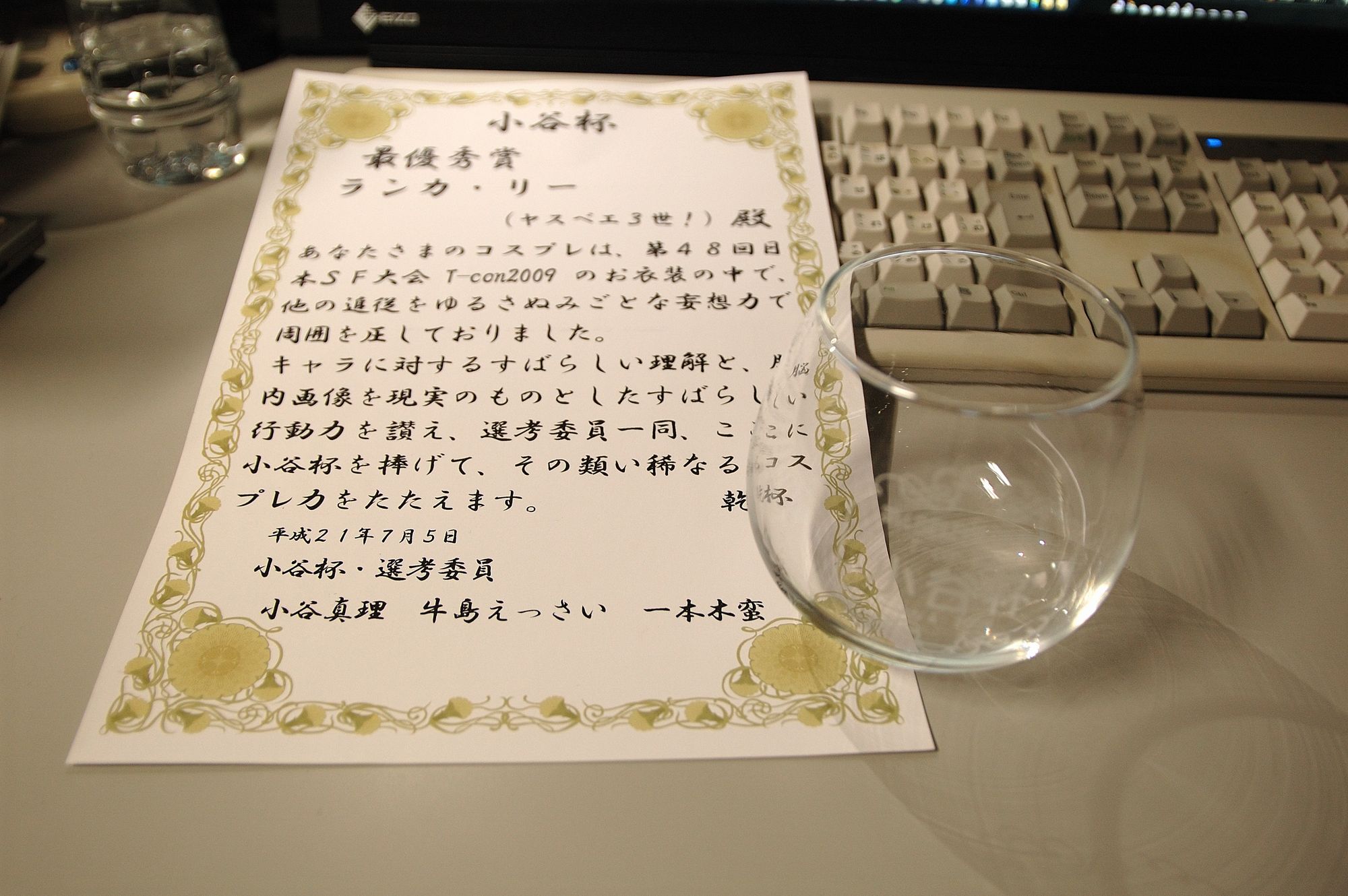第48回日本SF大会 とちぎSFファン合宿 T-con2009 無事終わりました! そして、速報です。 小谷真理先生、牛島えっさい先生、一本木蛮先生による「小谷杯・マスカレード賞」(マスカレードとは概してコスプレコンテストのこと)で、最優秀賞をいただきました!