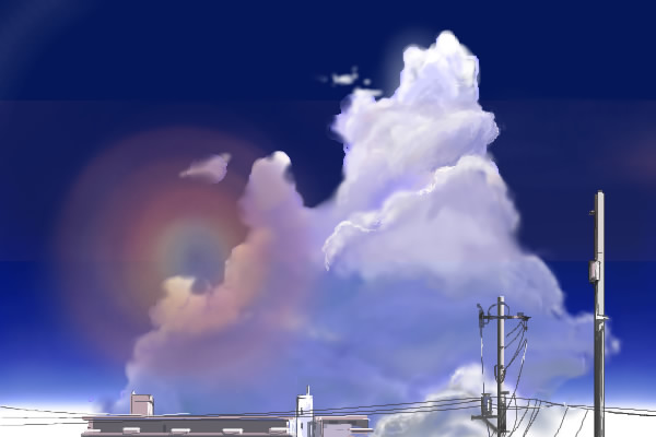 新海誠美術作品集を先週購入したよろこびもあわせて、今日の晩はそちらから一本、お絵描きBBSにて背景習作としてみました☆