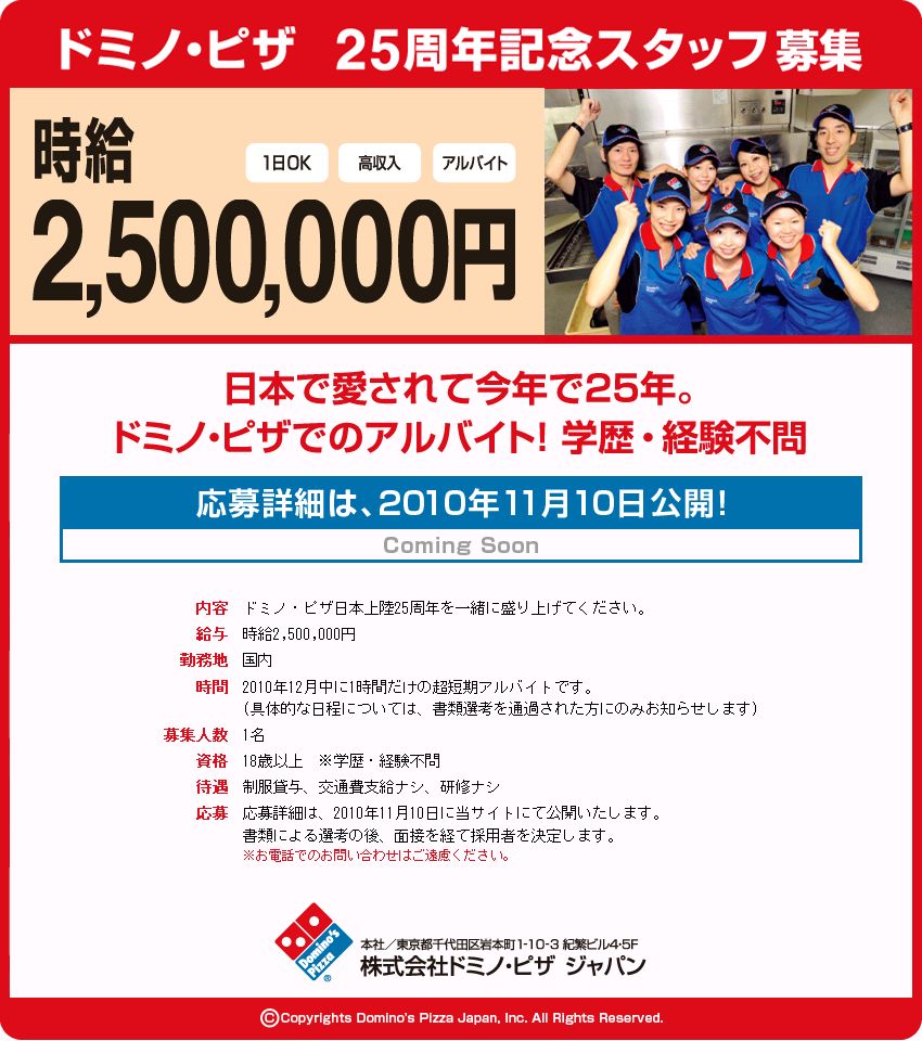 時給250万円!ドミノ・ピザ 25周年記念スタッフ募集