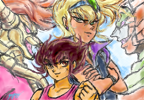 ’09年10/24Sat,うちのOebit(しぃぺ)で完成の、「獣神ライガー」のリュウ・ドルク。350×250・jpg・50・1KB。カセットレーベル絵・模写。マントの裾をつかむ、左指が入りきらず;