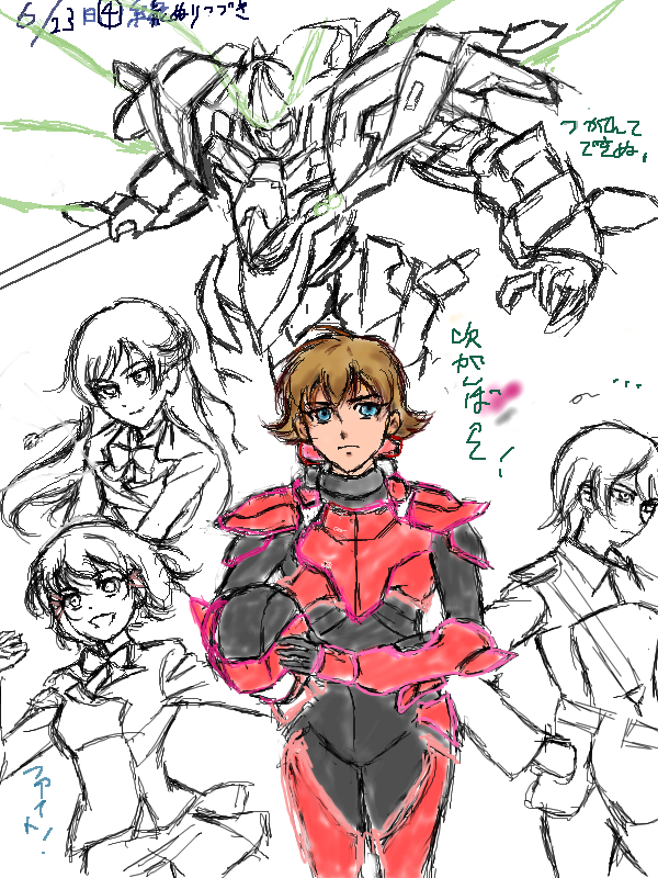 | 説明文 | 6/23Sun,ヴァル絵も4回目、普通ならバストアップが多いから、4回もしたら、完成する頃・・・ 欲張って、キャラ4人+メカまで入れて・・・ 22Satも仕事多忙+疲れ。腹もくだすし;・・・ 目しょぼしょぼ、首肩凝って 集中できず・・・ なくなく投稿; ハルトの線直しと、コスにざっと塗っただけ。 次も1週後・・・ 次こそ、もっと進める? ネタばれ、注意! この前のヴァル、ショーコ父が出た! 生きてたが、ドルシアに捕まって・・・ タイトルの「軍事法廷」とは、ドルシア艦内で、敵に勝手に、罪なすりつけられ・・・ ショーコもモジュール77の総理に選ばれ、代表として敵と通信出来たが・・・ 結果的に見ている所で、父を殺され、次回、どうなるやら・・・ また皮肉にも、「お父さんを助ける!」と約束したハルトが、まさか敵艦に居るとは 知らずに、必殺腹切ブレード使用で・・・ ハルトも次回、すごくショックだろう 前回、ハルトの発作(呪い)で、サキを襲って・・・ セクハラしたようだし >< お互い裸だったからな・・・; その点、はっきりと描かれて無かったが、ハルトは 謝ろうとして、敵襲・・・ 最後に、月に着いてからの予定だが、サキに求婚して・・・! ガイドムービー少女も、可愛い顔して結構エロ(笑 「ケッコン!」って連呼して飛び回ってたし、貴生川の「受け入れる」を「ソウニュウ・・・」と、赤面するし; 最近なぜか、次回予告が放映されなくなって、HPで見れるが、次、最後の紫ヴァル ・・・ パイロットはショーコ? 父亡くなって、自暴自棄、仇討ち・・・となりそう。 キューマ、サキは、ヴァルの呪い(人外になる、噛むと他人を乗っ取れる)を知ってたが、 ライゾウは知らずに勢いで。 サキは、興味本位と、寂しさで、乗ったが、キューマ、ライゾウは仇討ちで・・・ そうなると、ショーコも、父の仇・・・で。ショーコの世話で、せっかくなつきかけてたアキラ が、携帯で、ショーコの回りの生徒たちの目にさらされ、パニックになった; まさか、アキラが乗る?・・・ あまり可能性無いが。引きこもりだし 謎多い・・・ カインもヴァル関係有るし、首の模様、一族がどうとか・・・ 段々深刻になるのはしんどい; 明るいシーンも有れば良いが・・・ 6月で終わりそうにないので、9月までらしい |