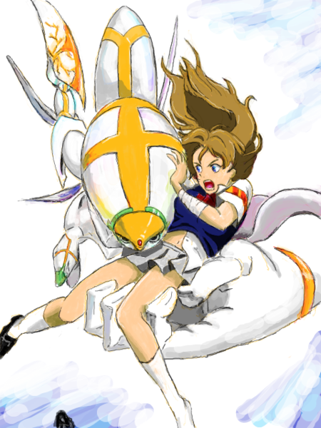 | 説明文 | '09年、12/15Tueに、ちぃのゆんさん宅でUPして頂いた祝い絵・手ブロにて、『忘念のザムド』より。アキユキ・ザムドとハル・450×600、871KB、png 頂いた順にUPしようかと思うが、ランダムかも; 許可申請待ちとか; 後で説明を詳しく・・・ '09年秋に、マイフレ・みんちょさんのお勧めで、偶然、地元TV局の深夜で、「ザムド」放映を見つけ、放映後半あたりから見て、設定や世界観が不明のままハマッた。 ゆんさんもDVDで鑑賞中で、描いて下さったv ザムドとは、ヒルコ(魂?)を腕に宿したり、何かを飲み込むと、そう呼ばれる異形に変身する。これは、主人公アキユキのザムド。 楕円系の頭と肩、上腕が大きく、妖精のような羽で飛べる。幼馴染の少女ハルが長髪なので、前半の頃(魚津は見てないが;) ザムド化したアキユキを見て分かったので、ハルとは通じ合っているのだろう。後半、記憶を無くしたアキユキを迎えに来た。 アキユキのザムドは、『忘年の』と言う肩書き?が付く、特別な物らしい。世界の仕組みが分かった時、悲劇の皇帝を救う行為は、素晴らしかった。 普通の高校生で、何となく生きていたアキユキ・・・その元の面影も無い姿。ザムドの手に受け止められているハルは、落下中を救われたのか? 緊張感の有る表情。 空を颯爽と飛ぶザムドの躍動感が伝わって来る! 素敵な祝い絵と、UP許可、有難う御座いました! お返しが、「ぼくタマ」シオン、とモクレン・・・ 残念レベルで済みません アチャ・・・(ノ_< ;) |