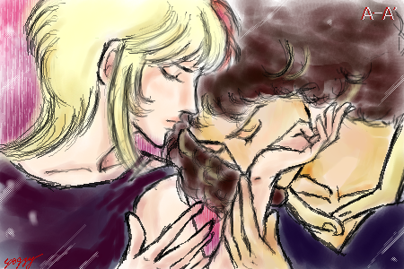 | 説明文 | 1/15Fri,AQUAさんへのBD絵、萩尾望都『A-A'』より、アディの手首へ口付けするレグ。1回目、軽く黒主線入れ。 萩尾絵は、初挑戦。少女漫画の繊細な線は、難解; 話のあらすじは、カバー裏によると・・・ コンピューターのエキスパート・一角獣種のアディは、事故で命を落とすが、クローンとして蘇る。彼女を待つ恋人レグは、複雑な思いにかられていた。宇宙を舞台に、変異種の悲哀と朴とつな愛を描いた作品 クローンで、元のアディでは、無い事に、最初抵抗が有ったレグ。共に暮らす内に段々と 打ち解けて来る。アディが唯一の友だった、ポニー(毛長の黒馬)が、クレバスに落ちて死んだ時のアディの手首、背中の傷が、クローンには当然ながら無い。 その思い出を語る本体のアディの手首に口付けするレグ・・・の図。 本編なので、モノクロ、二人とも目を閉じ、黒い服と、レグの黒いウェーブの長髪(カラーでは 灰色や緑など)が、背景のベタと一緒になっている画面処理・・・ 複雑な構図で無いが、右横向きのアディ、伏し目で口付けするレグの鼻、顔輪郭、 指・・・が難;ロマンチックなシーンが、お笑いにならないか; どうもバイオリズム低下時期で、踏ん張りが効かない; 目に負担が来ないよう、一旦保存で、明日16Sat夜中完成を目指す・・・ 構図は簡単そうだが、髪やらやはり難;・・・ 1/16Sat,2回目、線直し、塗り、完成。手本見ても、色々おかしい; 髪、指…アディも 右横向きで、鼻、口が; 指も、枝のよう; 少女漫画難しい(>_<") 資料では、アディの後ろ髪は省略で、モノクロページなので、レグの髪、2人の服と背景が 黒ベタで溶け込んでいる。 塗りで、アディの服は、赤紫、レグは青紫、髪は焦げ茶へ。セリフも、アディ本体が、唯一の友の馬を亡くした時の傷(手首)を見せ、レグは傷に口付けした。 「あのアディの髪にふれ あのきずにくちづけをした・・・あのきずはもうないのだ」 セリフを入れたら邪魔なので、作品タイトルだけ。 背景は黒ベタだが、上のコマの手描き縦線をテクスチャで、ベタに散らした白丸を、白い 細かいドットで。 線も再現しきれてないので、塗りも、我流; 薄い水彩タッチで、濃い色は少ないが; 簡単そうに見えて全然; ただ、初めて挑戦して、少し世界観や、絵に触れられたのは良い体験だった。非公開のまま、しばらく・・・ 1/23Sat,日記添付したので、下書き→外部公開へ |
