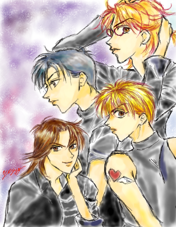 | 説明文 | ’10、7/17Sat,『花ざかりの君たちへ』テレカ模写1回目。4人、上から梅田(眼鏡)、佐野(左横向き)、中津(横向き、カメラ目線)、難波(右向き、頬杖) 複数居ると、バランスが; 難波の顔が小さい; 難波以外3人左横向きだが、視線、ポーズが違う。 髪の線、目、口、指、全体のバランス、位置など難しいが、特に、中条先生の特徴の、口。独特の半開きがうまく描けない;やはり少女漫画は、線がきれいにせねば見苦しいから難しい(><) 軽く主線入れて保存、約2時間。 色トレスは趣味(笑 原画も、佐野以外の3人・・・いや、梅田だけ?髪の線が、茶色。梅田→中津→難波の順に、段々濃くしていった。慎重にペン入れしたが、難。 原作のイケメンの格好良さ、色気がどこまで出せるか? 続きは明日7/18Sun予定だが、外出なので、あまり出来ないかも; 一応、みんちょさんへの祝いのつもり; 待たせると思う・・・御免よ^^ゞ 7/24Sat,2回目、線直し、塗りへ 微妙に原画と違う。4人の位置や、目や… 髪の線も荒いが、塗りへ。原画は、アナログ水彩かカラーインク? 肌色は薄い黄系? はっきりした方が好きなので、黄系パレットいじって。RGB自在に操れたらな… あと水彩、ブラシとA値? 梅田と中津は金髪で、梅田の方が明るめ。難波は焦げちゃ。セピアパレットかと思ったが、青反転の茶系で。 佐野は、灰色。 どうも暑さで体力低下; 眼が充血で、首肩こり、集中力が続かない; あと、服(全員、モノトーン)と背景(紫の水彩)・・・ 明日25Sunに完成希望^^; 7/25Sun、3回め、塗り続き。肌、髪を軽く塗ったので、髪続き、服、背景。 どうも毛束も、きれいに塗れない;少年漫画でも、きれいな絵が有るのに; 佐野は、グレーだが、青みを加えた。皆前髪や髪の流れが難。 服も全員モノクロなので楽v 黒濃淡で・・・ しわの影も難; 背景レイヤーを作り、 テクスチャで・・・ 大体ブラシで塗る。柔らかいので。水彩だとボケ過ぎて模様がわからなくなる。原画は、水彩でざっと・・・ なんか微妙に似てないし、色々難点挙げればキリが無いが・・・ 完成としよう。 みんちょさん、お待たせしました! 勝手に花君選んで描いたけど; 佐野が一番似てるかな?・・・ファン→外部公開へ |