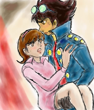 説明文 kist.jiro.mitsuko.100911.jpg  うちのえかきすとで、’10、9/11Sat完成の、キカイダー・ミツコを抱くジロー絵、300×350、40.6KB、jpg