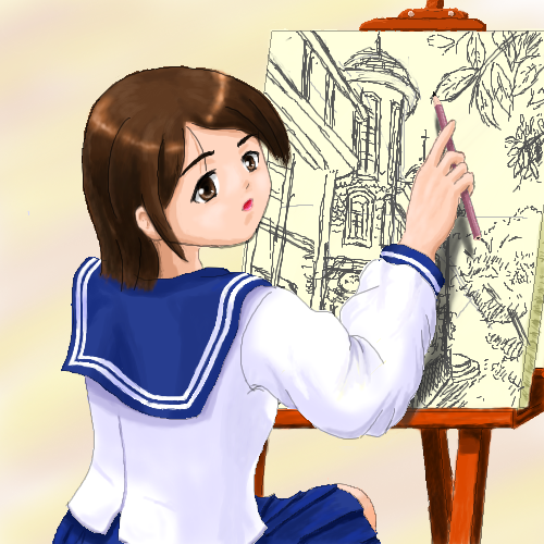 いつもと変わらない学校への道のり、ふと見上げた時、一面の青空が心を軽くさせる。そんなひと時を描いてみました。