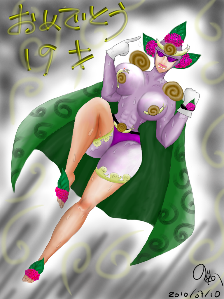 今日は山田直人さんの19歳のお誕生日です!! おめでとうございま~す♪ 風邪のお見舞い&ハピバプレゼントに山田さんのオリキャラ「マイマイマン」↓ の嫁っぽいのを描かせてもらいました♪(こらぼ可能になってたので;;) これで熱が下がるのを祈りつつ・・・←←(゚▽゚;*) って、折角のお誕生日なのに、風邪、早く治してね(>o<) 長引いてるので心配。。。 ipadのArtstudio使用で指描きなので細かいトコはスルーで(-。-;) レイヤー5枚に描くのはアナログに近い緊張感があるかもです。 (ってアナログで描かないから分かんないけど;;) ヘンなトコだらけだし雑だけど、目と手が疲れて来たのでこれが限界orz ipadって画面が小さいからほとんど拡大して描くのだけど、 スクロールしてみてアジサイの花の色が違ったのに気がついた!(>o<) 独立レイヤーなら色調変更が出来るんだけど、 さすがに安価なアプリにはそんな芸当できませぬ(。・ω・。) PC描きの時はバケツツールを多様してたので着色は楽ちんだったけど、 ipadでは選択範囲のコピーを別レイヤーに、とかできないので ちまちま塗りますた・・・ 山田さんのマンガをプリントアウトしたのを参考に描いたけど、 今回まじまじと見てみて、山田さんの細かい所の丁寧な描き込みに驚愕!! ごめん、私は雑過ぎるの分かってマス(´д`;) 袖口のマイマイレースも描きたかったんだけどねー。 でもipadで細かい所描くのすっごく疲れるのよ~(-。-;) ま、気持ちだけ受け取ってね(^з^)-☆ え?19歳の誕生日なのに暗すぎる? マイマイマンよりは若干爽やかだと思うけどwwww ★マイフレさんへ^^★ フランスから来た居候さんは明日早朝京都へ出発〜\(^O^)/ メシ炊きご苦労さ〜ん、自分!!(´∀`*)b