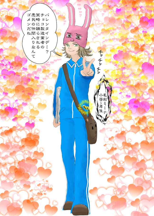 義理チョコやら友チョコやら逆チョコやら、本命チョコ以外ばかり大量に作らされウンザリ。 なので本物の愛をイラストに込めてみました←w この子はオリキャラの毛利ミーナ@うさみちゃんです。 どうぞ宜しく〜(*´∀`) 毛利 ミーナ コリンの妹。日本生まれの小学5年生。身長158センチ、体重ナイショ。 家族一のしっかり者。 IQ150、頭脳明晰ゆえ、オツムのトホホな兄コリンをバカにしているがコリンに溺愛されている。 ボーイッシュで闘争心が強い。 悩みは25センチのデカ足。 マンガオタクで増田こうすけと結婚するのが夢。 将来の夢はマンガ家。 毛利 コリン(兄)の設定は↓ カトリーヌ・ドゥ・ラ・フォンテーヌ・ドュ・ポエット(母)の設定は↓です^^ 毛利 元里(父)の設定は↓