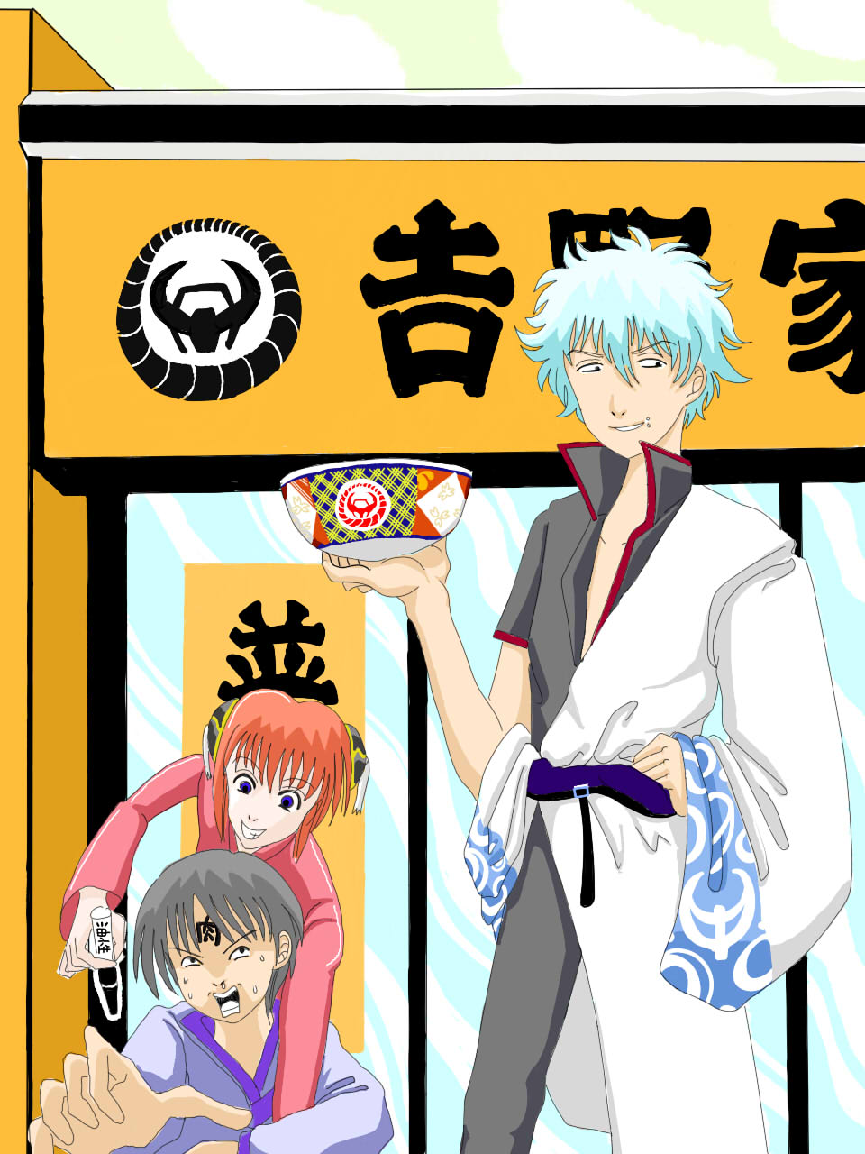 時事ネタで牛丼闘争にまずは銀さん&姉弟の弟の方(名前忘れたw)&神楽ですw