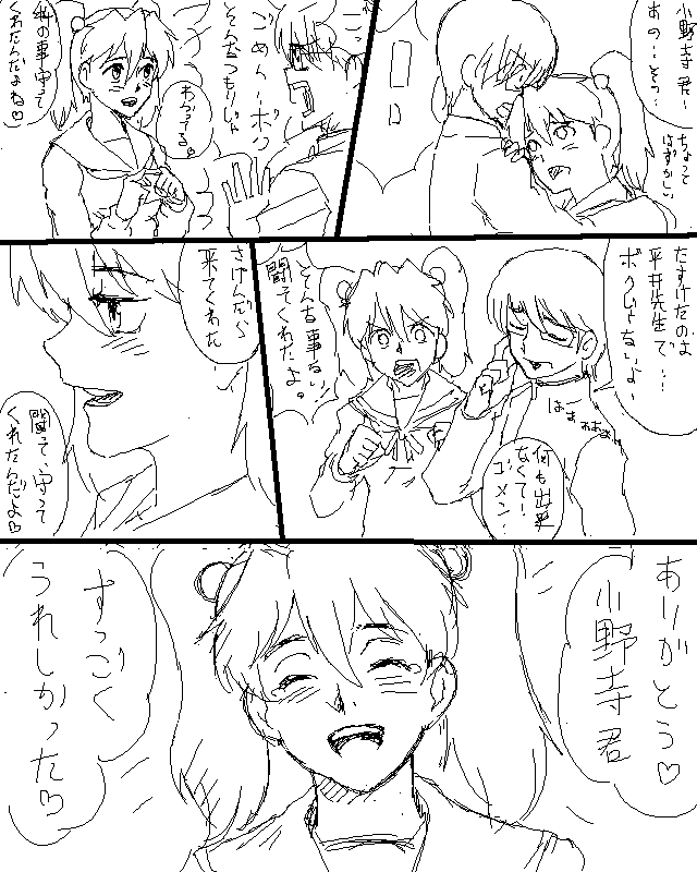 「じゃあ、先生がいなかったら助けてくれなかった?」 「塚田を転がした後に二人で部室に篭るか、手を引っ張って逃げるしかなかったね」 「やっぱり、守ってくれるんじゃない」 「逃げるだけだよ」 「いいよそれで、怪我して欲しくないもの・・」 とか何とか・・そんな二人(笑)