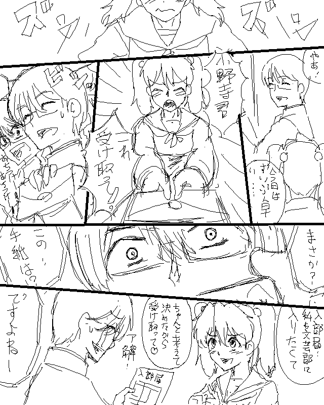 昨日の入部を再構成して書き直してみた。 構成的にはこっちのほうがそれっぽい 毎ページ落ちが付くのが理想ではある気はするのだが つい欲張って詰め込んでしまうのは私の構成力の弱さ(笑)