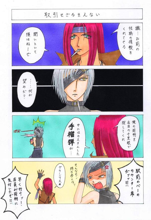 | 説明文 | 線画出来てたので着色しました~! なので塗り→エアブラシ→トーン→ホワイトの工程をやりましたが・・・これだけで4時間半掛かってるってどういうコトorz トーンカッターの刃を新しいのに交換したら切れ味良すぎてビビッたww こんなに切れるものだったんだ・・・!(どんだけ交換してなかったんだ; さて前回に続いてまた識が出てますw 2話目にして眼帯の謎も解けるし輪をかけてキャラ崩壊してますが自重出来ません←← そして予告通り新キャラ登場してます☆★ コードネーム:グラナード 本名:カルロス・ヴェルダー(29) 「ラグナロク」在籍のSランクのアサシン。識と同期。 情報と破壊工作に精通する。 爆弾好きの危険な男。 識もカルロスも年齢で迷ったんですょね~^^; 29か32歳のどっちかってコトは決まってたんですケド(特に意味はありません。何となくそう思ったんで ルイ、イリアスに続いて3人目のタレ目キャラですぉw ワイルドでオヤジっぽい空気を出したかったんですが・・・難しいな。。 メキシコ出身なんでスペイン語圏です。 グラナードはスペイン語で柘榴の木、柘榴の実を意味するグラナーダは手榴弾の意味もあります。 ヴェルダーは真実という意味です。 4コマ目のグラシアスはありがとうの意。 識と同じように目に特殊な能力があり、彼が情報通なのは近い未来を視るコトが出来るから。 能力を使えるのは生きているモノに限られるが自分のコトは視えません。 識とは一緒に飲みに行く仲だったり。 よく見えないと思いますが識の右目は銀色です。 今回識はいちご牛乳(正式名称は関東・栃木いちご)を飲んでますwww 今見直すと「ばぶー」って効果音ヒドイなwwwww とりあえずいちご牛乳盛大に噴き出しました。 以前mieronさんがデルモントは実在の人物を参考にしていると書いたら気になってくれてたので今回のカルロスや識も含めて日記で軽く触れておきます。 割とどーでもいい内容なのでおまけ程度に読み流して頂ければ。 |