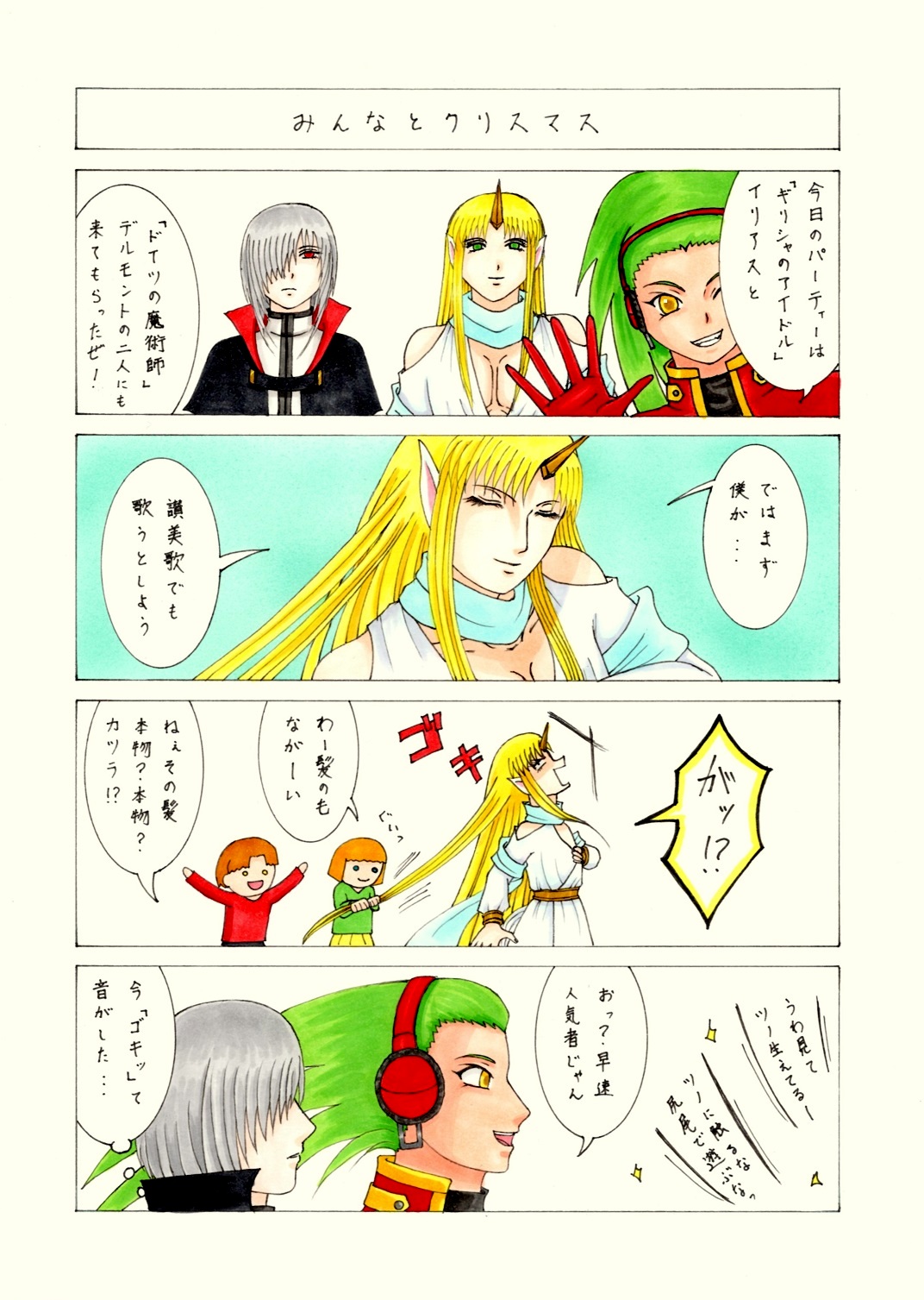 | 説明文 | くっそ久しぶりに野郎3人組の出番ですw グリフォンはレースやバウンティハンターで得た賞金を教会や孤児院など子供達の為に寄付しているという設定が登場時からありましたが既に誰も覚えてないだろうなwww 毎年クリスマスなどのイベントも教会で子供達とパーティーしたりしてるので今回は友人であるイリアスとデルモントにも来てもらってます。 早速イリアスがヒデェ事態になってますがデフォルトでした。 次回に続きますがクリスマスまでに間に合うかな・・・ あとこいつら描くの久しぶりすぎて誰1人とてちゃんと描けなかったことをご報告いたします。 グリフォンの髪型とかのっぺりしすぎた・・・ |