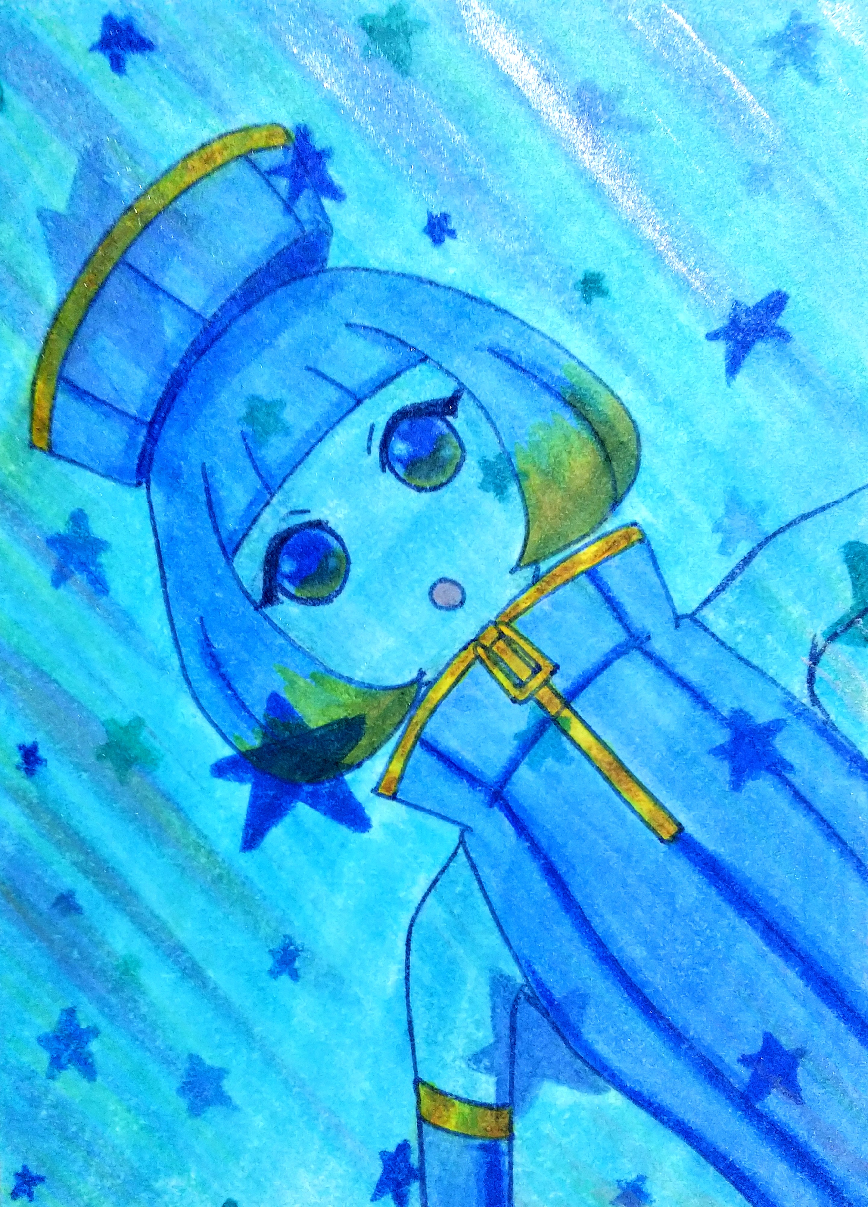 | 説明文 | 来週から始まる「あお展」用に描いたATC。 今回は青がテーマの展示会なので青い絵です。 これいつもの紙じゃないからミスったんですわ。 青のマルチライナーでペン入れしてコピックで着色したらまさかのマルチライナーが滲むっていうね!! なのでラピスの目と前髪の間が青く滲んじゃって直せないし肌部分だから目立つしでいっそのこと全部青で塗り潰して当初の予定と全然違う絵にしました(汗 こっそり袖のデザイン間違えてるけど気にしたら負けだよ! 写真じゃわかりずらいですが青で塗り潰した上に白のラメ顔彩で更に塗り潰してます。 |