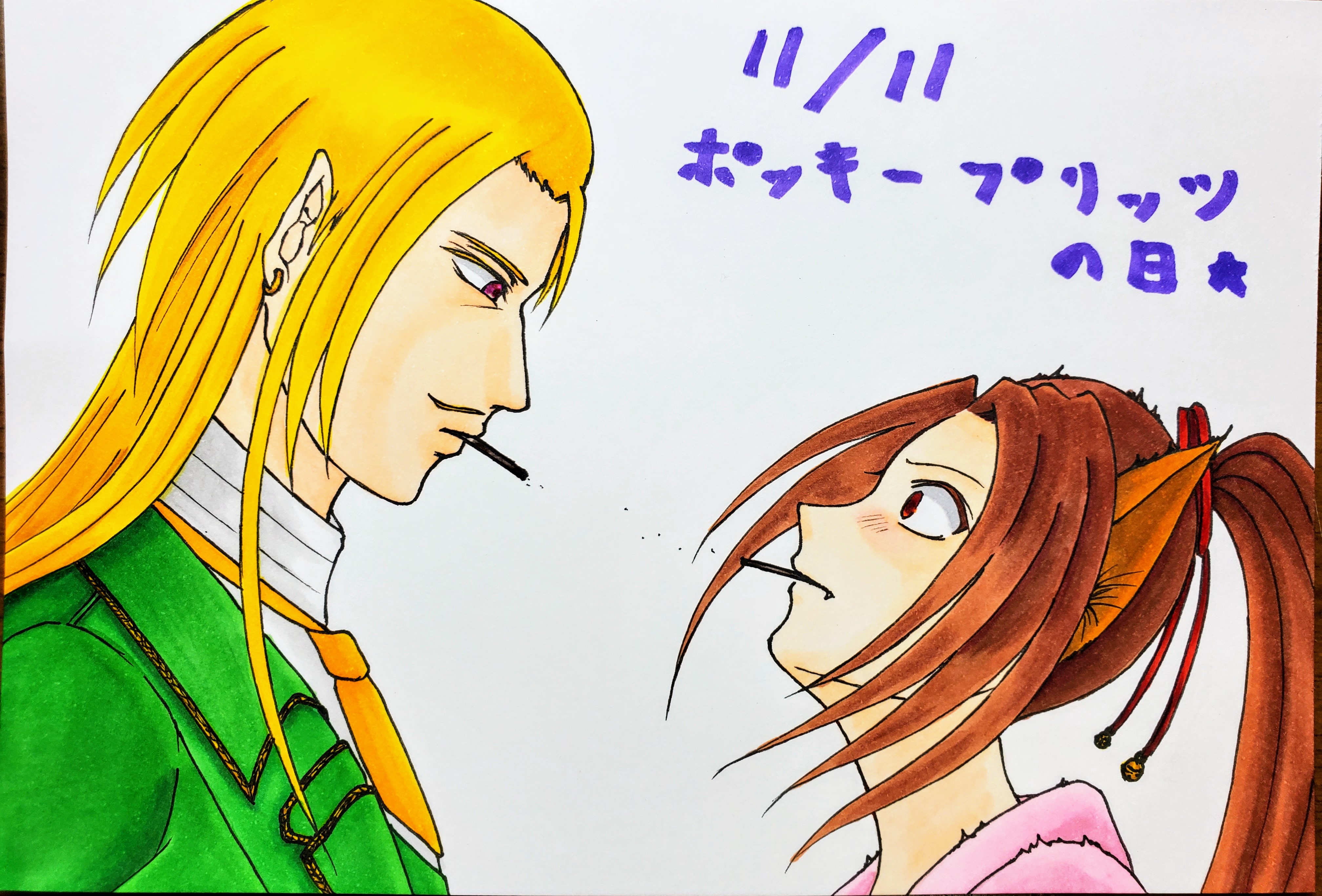 | 説明文 | 今年のポッキー&プリッツの日イラストはとんでもカオスですね!!!!! 以前作った診断メーカーでキャラ決めたらこんな事態に・・・! ジョヴァンニと猫定でポッキーゲームです!! イタリア人のおっさんと猫又の少女のポッキーゲームとか一体誰が想像できただろうか・・・? いや、できない(確信 でも新鮮だし面白かったからまたなんかの機会にやるかも笑 |