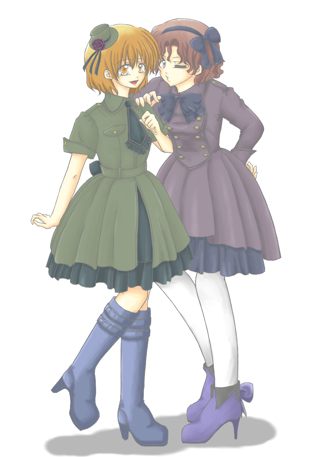 | 説明文 | やっぱり間に合わなかった「軍服&軍服ワンピ」お題。 mieronさんゴメンよー! 開催当時に意気込んでた私をどうにかしてやりたいwww 宣言通り、うちのドリーム&ポリディの双子で描かせて頂きました☆ 服は既製品。 「アトリエ ボズ」さんというところで取り扱っていらっしゃるのかな? 検索画像一覧で見ちゃってるのでちょっと詳しいことわからないのですがw 小物と靴はオリジナル。 色塗ってみて、やっぱ既製品って素敵だなって思いました(キリッ 靴の配色センスで失敗した感拭えないwwww けどそれもマツモトクオリティです← 今回線画もデジタルなのですが、 自分頑張った!!!! 服の色塗りしてる時にボタンとか色々書き忘れてることに気づいて修正しましたw デジタルって便利だなー(棒読み |