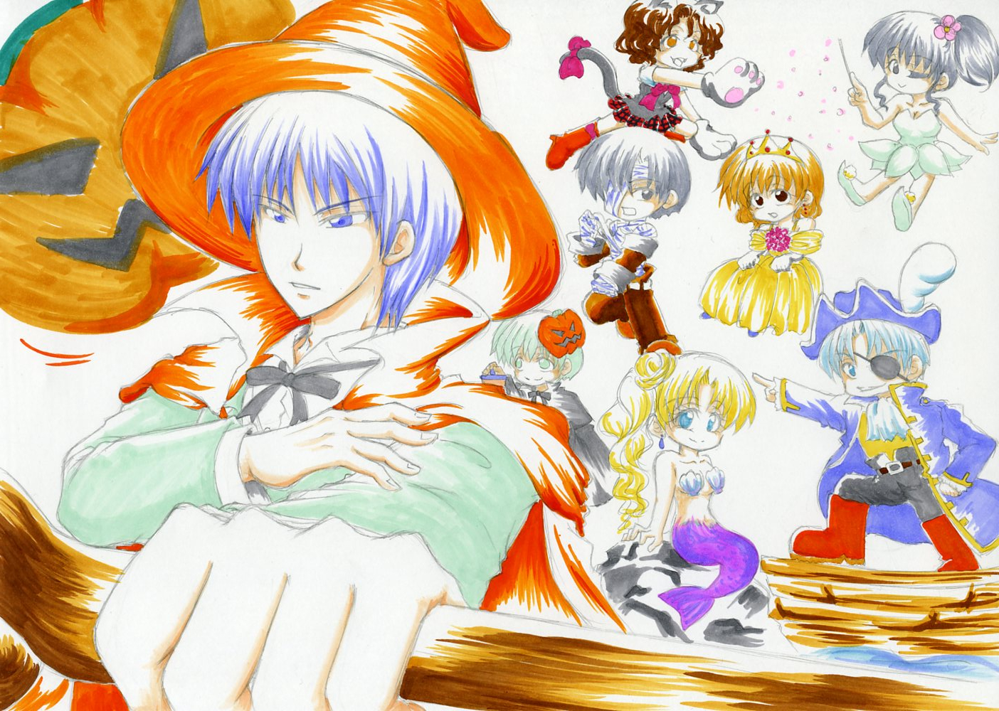 | 説明文 | ハロウィンが終わってるって!? 当日に描き始めたんだもの、そりゃ間に合うわけがないw 毎年ハロウィンの度にハナさんに「スネイエス小さい」と苦情を頂くので 今年は大きく描きましたとも!!! あんまり考えなしに人を継ぎ足してったらティストの存在感なかったwww スネ⇒魔法使い シェ⇒人魚 エス⇒海賊 ヴィ⇒マミー ポリ⇒お姫様 セシ⇒妖精 ドリ⇒黒猫 ティス⇒ジャック・オ・ランタン まとまりがないのは仕様。 センスがないのは元々www |