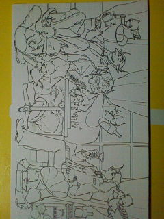 面白いお題があがってたので描いてみた。 ↓ 横長にしたら写メだと全体が入らない。 ↓ 縦向きに撮っても向きを変えられない。(PCがないので直せない) ありゃりゃ〜。やっちゃったかな(・・;) とりあえず着色してから何か考えるとしようo-_-)=○☆