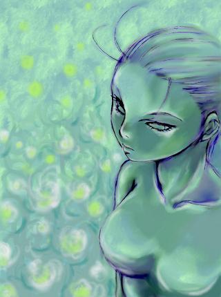 コレも2色使いのテクスチャ背景に、スキャン線画を乗っけて、こっちは影に色は追加無しで、擦って色調を調整して、最後にハイライトと、バックのウネウネにちょっと色を付けました。