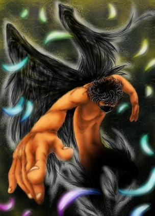 背中だけでなく下半身も羽毛に覆われる感じに描きたかったんですが、画力が無くて、グラデーションで明度を落としてごまかしました・・・