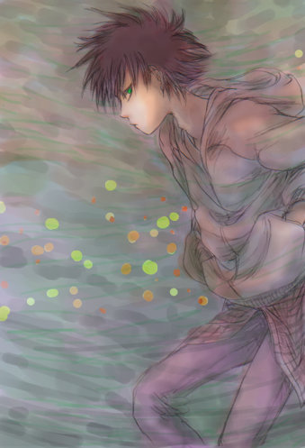 少しクールな感じを出したいと思って描いた線画なのに、塗りのイメージがないまますすめたら、なんとなく今くらいのたそがれ時な雰囲気になって、そろそろおうちに帰ろうかな…みたいなさみしい絵になりました・・・ 今ちょっと、我愛羅に異装させたいプチブームが来てます、わたしに・・・ ええ、昨日のSDの影響はありますよ!詳しくは日記に書く。
