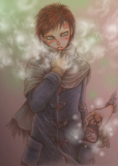 このシュチュエーションは、我愛羅きっと寒いの苦手だよね(砂漠の我愛羅ですから)最近寒くなって見かけるダッフルコート、きっと似合いそうだよ…着せたい・・・盛大に襟巻巻かせたい、さむがってる我愛羅のポケットに無言であったかい缶飲料突っ込んであげればいい!・・・という感じで、たいそう萌え上がって描きました。ですのでココア持ってる手はシカマルです、コーヒーよりココアが、甘ったるくていいかなと思うけど、我愛羅は甘いのきっと苦手…