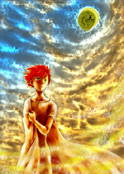 ベースを茶から紺のグラデーション斜めに引っ張って、空と砂漠が入り混じる感じをイメージして茶系濃淡で砂を乗せこんで、途中で覆い焼きで「照り」を入れたあたりで、確かに新たな(自分的に)手法を獲得したぜ!と思った瞬間があったのですが、舞い上がっていつも通りやりすぎて、すでにその確信はないです・・・