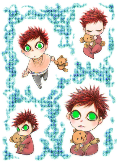 トモコレやって、生まれて育っていく子供たちを見てると、可愛くて無性に無邪気なオチビ我愛羅を描きたくなって、クロッキー帳にザクザク描いたうち、4個スキャンしてAzで合成して、まとめて塗りました。 額に愛の字が刻まれる前の幼少時代には、わずかでも子供らしいひとときもあっただろうか・・・とか思うと、切ない気持ちになるのです。