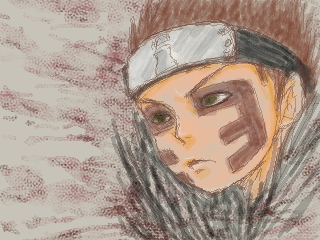 砂隠れの忍は顔にクマドリというかペイント入れる人が多いですが、件の彼のペイントはアレ、我愛羅の砂瓢箪に貼られてた札に書かれてた、『ヨ』みたいな『3』みたいなあの柄なんでは?